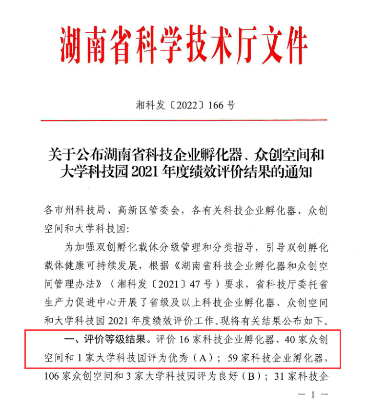 克日,2021年度湖南省科技企业孵化器绩效评价效果出炉,湖南省磨练检测特色工业园孵化器获得A类优异评定,岳麓高新区仅此一家!